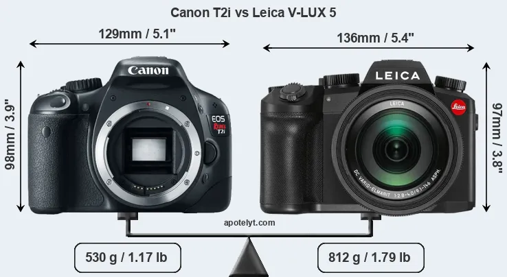 The physical size and weight of the Canon T2i and the Leica V-LUX 5 are illustrated in the side-by-side display below. The two cameras are presented according to their relative size. Three successive views from the front, the top, and the rear are shown. All width, height and depth dimensions are rounded to the nearest millimeter.