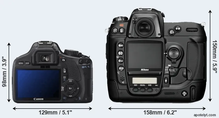 The physical size and weight of the Canon T2i and the Nikon D2H are illustrated in the side-by-side display below. The two cameras are presented according to their relative size. Three successive views from the front, the top, and the rear are shown. All size dimensions are rounded to the nearest millimeter.