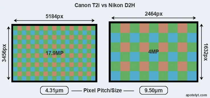 Despite having a smaller sensor, the Canon T2i offers a higher resolution of 17.9 megapixels, compared with 4 MP of the Nikon D2H. This megapixels advantage comes at the cost of a higher pixel density and a smaller size of the individual pixel (with a pixel pitch of 4.31μm versus 9.50μm for the D2H). However, it should be noted that the T2i is much more recent (by 6 years and 6 months) than the D2H, and its sensor will have benefitted from technological advances during this time that make it possible to gather light more efficiently.