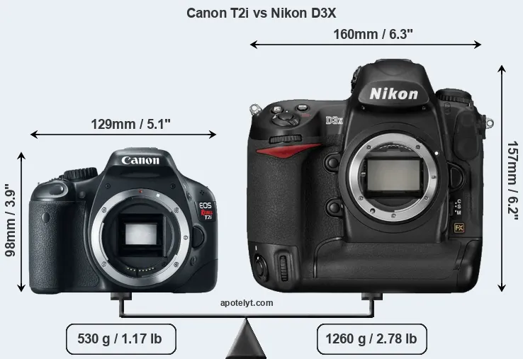 If the front view area (width x height) of the cameras is taken as an aggregate measure of their size, the Nikon D3X is considerably larger (99 percent) than the Canon T2i. Moreover, the D3X is substantially heavier (138 percent) than the T2i. It is noteworthy in this context that the D3X is splash and dust-proof, while the T2i does not feature any corresponding weather-sealing.