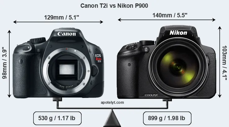 The side-by-side display below illustrates the physical size and weight of the Canon T2i and the Nikon P900. The two cameras are presented according to their relative size. Three successive views from the front, the top, and the rear are shown. All width, height and depth measures are rounded to the nearest millimeter.
