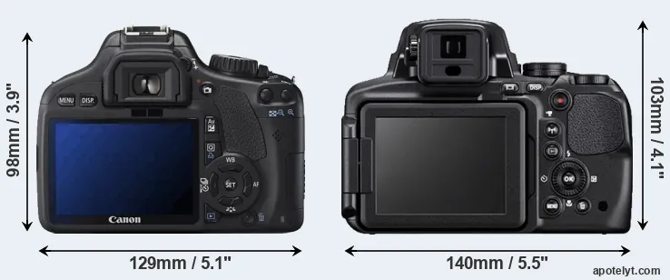 The above size and weight comparisons are to some extent incomplete and possibly misleading, as the P900 has a lens built in, whereas the T2i is an interchangeable lens camera that requires a separate lens. Attaching the latter will add extra weight and bulk to the setup. You can compare the optics available for the T2i and their specifications in the Canon EF Lens Catalog.