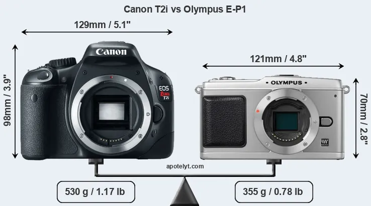 The physical size and weight of the Canon T2i and the Olympus E-P1 are illustrated in the side-by-side display below. The two cameras are presented according to their relative size. Three consecutive perspectives from the front, the top, and the back are available. All width, height and depth dimensions are rounded to the nearest millimeter.