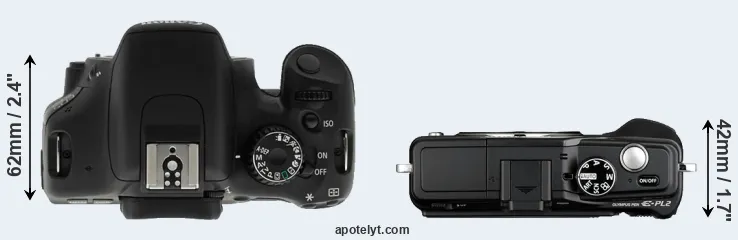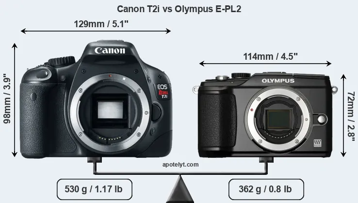 An illustration of the physical size and weight of the Canon T2i and the Olympus E-PL2 is provided in the side-by-side display below. The two cameras are presented according to their relative size. Three consecutive views from the front, the top, and the rear side are shown. All width, height and depth measures are rounded to the nearest millimeter.
