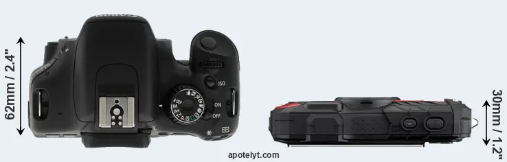 The side-by-side display below illustrates the physical size and weight of the Canon T2i and the Ricoh WG-60. The two cameras are presented according to their relative size. Three successive views from the front, the top, and the rear are shown. All size dimensions are rounded to the nearest millimeter.