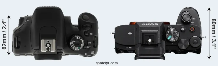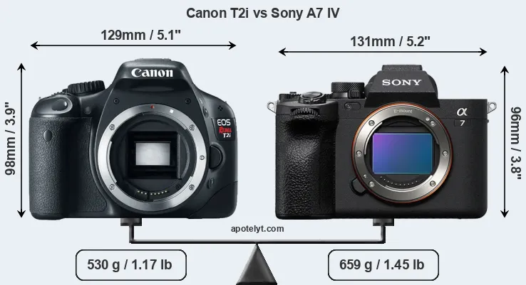 An illustration of the physical size and weight of the Canon T2i and the Sony A7 IV is provided in the side-by-side display below. The two cameras are presented according to their relative size. Three successive views from the front, the top, and the rear are shown. All size dimensions are rounded to the nearest millimeter.