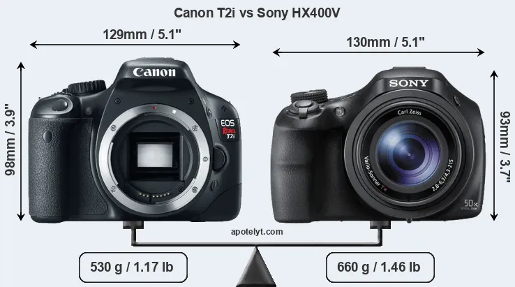 An illustration of the physical size and weight of the Canon T2i and the Sony HX400V is provided in the side-by-side display below. The two cameras are presented according to their relative size. Three consecutive views from the front, the top, and the rear side are shown. All size dimensions are rounded to the nearest millimeter.