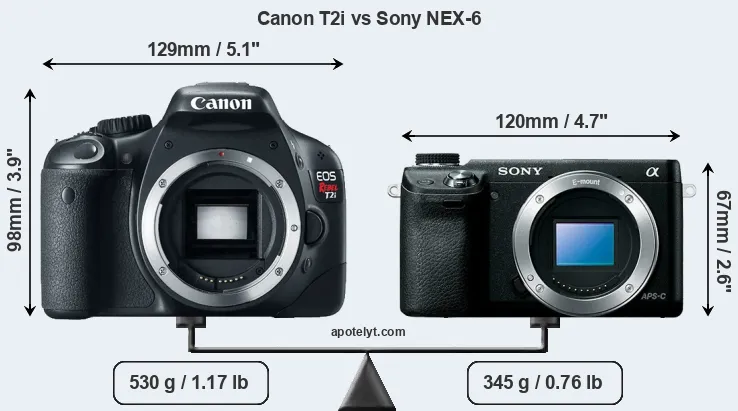 An illustration of the physical size and weight of the Canon T2i and the Sony NEX-6 is provided in the side-by-side display below. The two cameras are presented according to their relative size. Three successive views from the front, the top, and the rear are shown. All width, height and depth measures are rounded to the nearest millimeter.