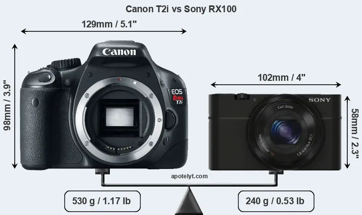 An illustration of the physical size and weight of the Canon T2i and the Sony RX100 is provided in the side-by-side display below. The two cameras are presented according to their relative size. Three consecutive perspectives from the front, the top, and the back are available. All width, height and depth measures are rounded to the nearest millimeter.