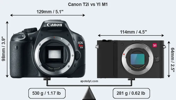 The side-by-side display below illustrates the physical size and weight of the Canon T2i and the YI M1. The two cameras are presented according to their relative size. Three consecutive perspectives from the front, the top, and the back are available. All width, height and depth measures are rounded to the nearest millimeter.