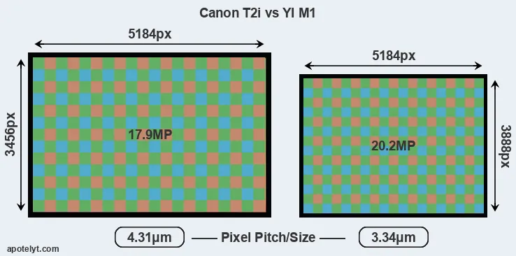Of the two cameras under consideration, the Canon T2i features an APS-C sensor and the YI M1 a Four Thirds sensor. The sensor area in the M1 is 32 percent smaller. As a result of these sensor size differences, the cameras have a format factor of, respectively, 1.6 and 2.0. The sensor in the T2i has a native 3:2 aspect ratio, while the one in the M1 offers a 4:3 aspect.