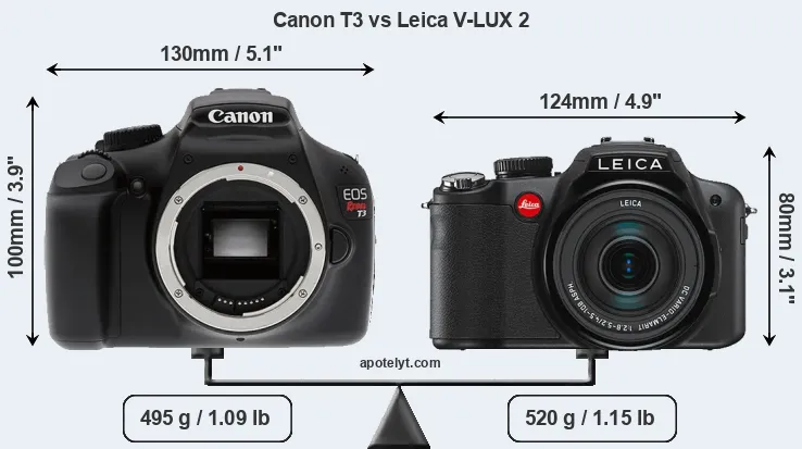 An illustration of the physical size and weight of the Canon T3 and the Leica V-LUX 2 is provided in the side-by-side display below. The two cameras are presented according to their relative size. Three successive views from the front, the top, and the rear are shown. All width, height and depth dimensions are rounded to the nearest millimeter.