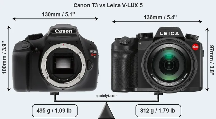 The physical size and weight of the Canon T3 and the Leica V-LUX 5 are illustrated in the side-by-side display below. The two cameras are presented according to their relative size. Three consecutive views from the front, the top, and the rear side are shown. All size dimensions are rounded to the nearest millimeter.