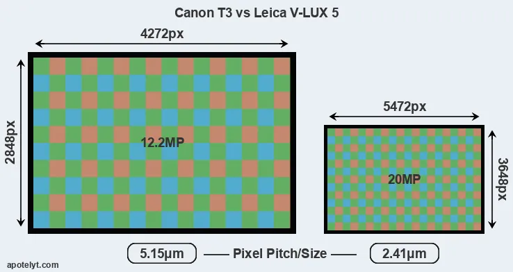 Despite having a smaller sensor, the V-LUX 5 offers a higher resolution of 20 megapixels, compared with 12.2 MP of the T3. This megapixels advantage comes at the cost of a higher pixel density and a smaller size of the individual pixel (with a pixel pitch of 2.41μm versus 5.15μm for the T3). However, it should be noted that the V-LUX 5 is much more recent (by 8 years and 5 months) than the T3, and its sensor will have benefitted from technological advances during this time that make it possible to gather light more efficiently.