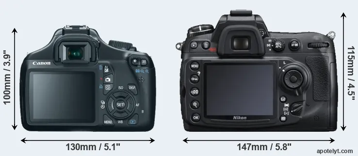 The physical size and weight of the Canon T3 and the Nikon D300S are illustrated in the side-by-side display below. The two cameras are presented according to their relative size. Three successive views from the front, the top, and the rear are shown. All width, height and depth measures are rounded to the nearest millimeter.