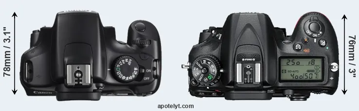 The physical size and weight of the Canon T3 and the Nikon D7200 are illustrated in the side-by-side display below. The two cameras are presented according to their relative size. Three successive views from the front, the top, and the rear are shown. All width, height and depth measures are rounded to the nearest millimeter.