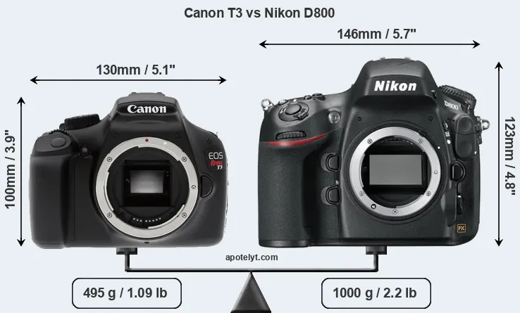 If the front view area (width x height) of the cameras is taken as an aggregate measure of their size, the Nikon D800 is notably larger (38 percent) than the Canon T3. Moreover, the D800 is substantially heavier (102 percent) than the T3. It is noteworthy in this context that the D800 is splash and dust-proof, while the T3 does not feature any corresponding weather-sealing.