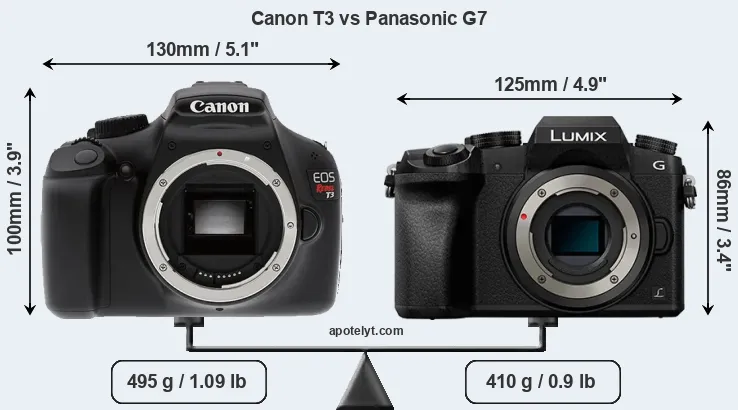 The physical size and weight of the Canon T3 and the Panasonic G7 are illustrated in the side-by-side display below. The two cameras are presented according to their relative size. Three consecutive views from the front, the top, and the rear side are shown. All width, height and depth dimensions are rounded to the nearest millimeter.
