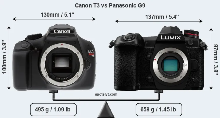If the front view area (width x height) of the cameras is taken as an aggregate measure of their size, the Panasonic G9 is somewhat larger (2 percent) than the Canon T3. Moreover, the G9 is markedly heavier (33 percent) than the T3. It is noteworthy in this context that the G9 is splash and dust-proof, while the T3 does not feature any corresponding weather-sealing.