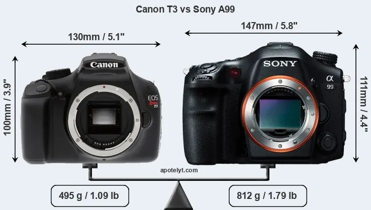 The physical size and weight of the Canon T3 and the Sony A99 are illustrated in the side-by-side display below. The two cameras are presented according to their relative size. Three consecutive views from the front, the top, and the rear side are shown. All size dimensions are rounded to the nearest millimeter.