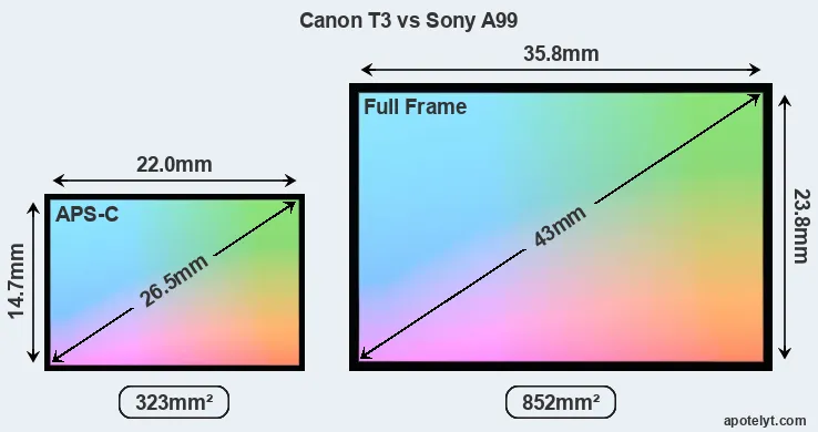 Of the two cameras under consideration, the Canon T3 features an APS-C sensor and the Sony A99 a full frame sensor. The sensor area in the A99 is 164 percent bigger. As a result of these sensor size differences, the cameras have a format factor of, respectively, 1.6 and 1.0. Both cameras have a native aspect ratio (sensor width to sensor height) of 3:2.