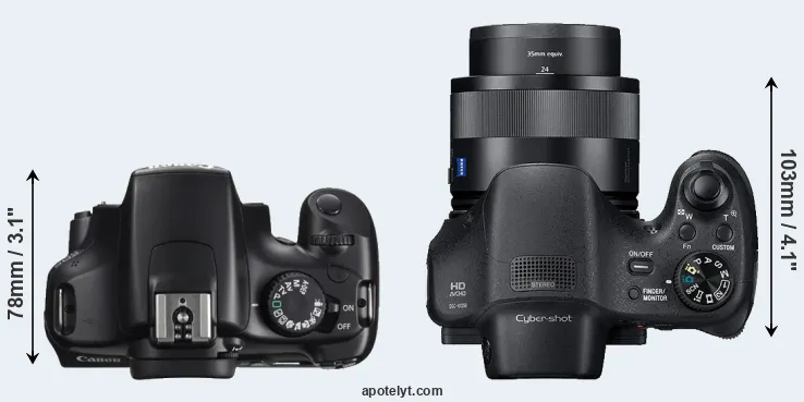 The side-by-side display below illustrates the physical size and weight of the Canon T3 and the Sony HX350. The two cameras are presented according to their relative size. Three consecutive perspectives from the front, the top, and the back are available. All width, height and depth measures are rounded to the nearest millimeter.