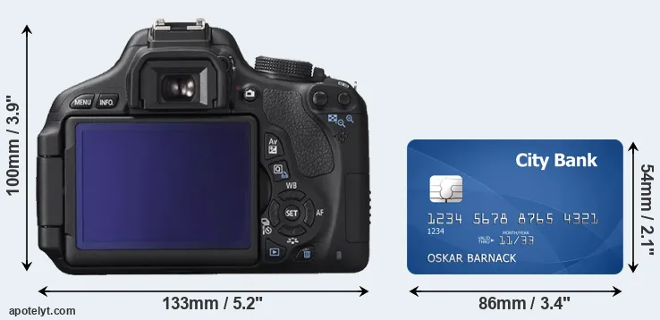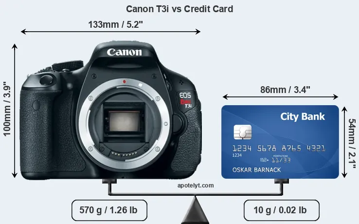 The physical dimensions of the Canon T3i relative to a credit card are illustrated in the side-by-side display below. Three consecutive perspectives from the front, the top, and the back are presented. All width, height and depth dimensions are rounded to the nearest millimeter.