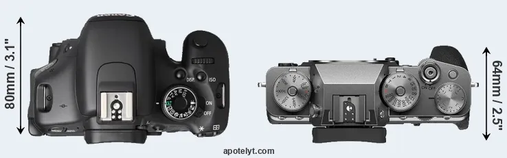 The side-by-side display below illustrates the physical size and weight of the Canon T3i and the Fujifilm X-T4. The two cameras are presented according to their relative size. Three successive views from the front, the top, and the rear are shown. All width, height and depth dimensions are rounded to the nearest millimeter.