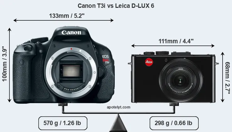 The physical size and weight of the Canon T3i and the Leica D-LUX 6 are illustrated in the side-by-side display below. The two cameras are presented according to their relative size. Three successive views from the front, the top, and the rear are shown. All width, height and depth dimensions are rounded to the nearest millimeter.