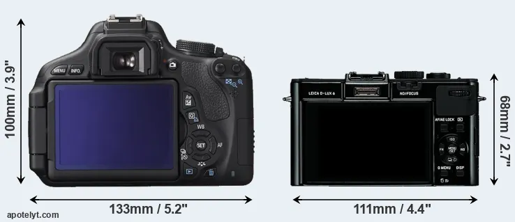 The Canon EOS Rebel T3i (called Canon 600D in some regions) and the Leica D-LUX 6 are two digital cameras that were revealed to the public, respectively, in February 2011 and September 2012. The T3i is a DSLR, while the D-LUX 6 is a fixed lens compact. The cameras are based on an APS-C (T3i) and a 1/1.7-inch (D-LUX 6) sensor. The Canon has a resolution of 17.9 megapixels, whereas the Leica provides 10 MP.