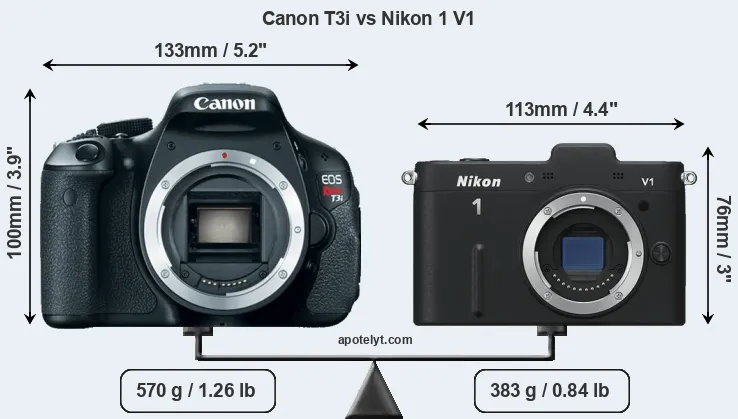 The side-by-side display below illustrates the physical size and weight of the Canon T3i and the Nikon 1 V1. The two cameras are presented according to their relative size. Three successive views from the front, the top, and the rear are shown. All width, height and depth measures are rounded to the nearest millimeter.