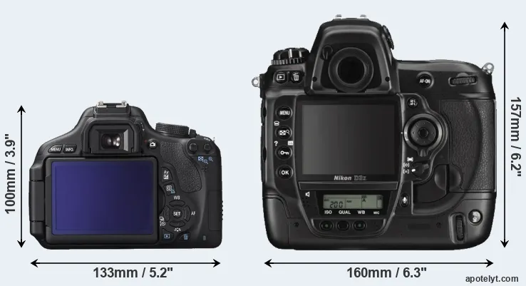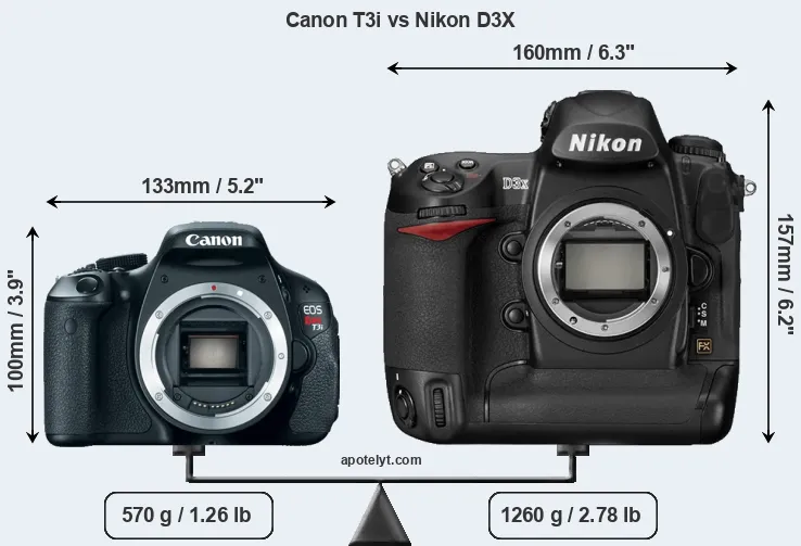An illustration of the physical size and weight of the Canon T3i and the Nikon D3X is provided in the side-by-side display below. The two cameras are presented according to their relative size. Three successive views from the front, the top, and the rear are shown. All width, height and depth dimensions are rounded to the nearest millimeter.