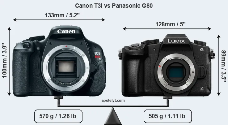 The side-by-side display below illustrates the physical size and weight of the Canon T3i and the Panasonic G80. The two cameras are presented according to their relative size. Three consecutive perspectives from the front, the top, and the back are available. All width, height and depth measures are rounded to the nearest millimeter.