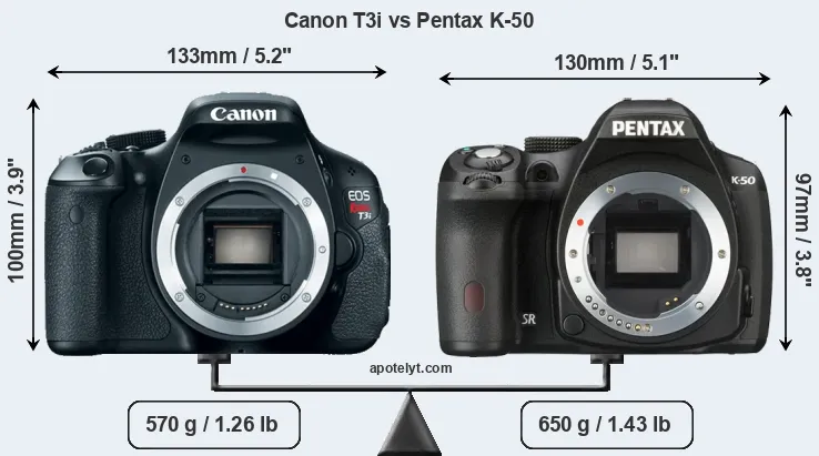 The side-by-side display below illustrates the physical size and weight of the Canon T3i and the Pentax K-50. The two cameras are presented according to their relative size. Three successive views from the front, the top, and the rear are shown. All width, height and depth dimensions are rounded to the nearest millimeter.