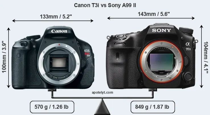 The physical size and weight of the Canon T3i and the Sony A99 II are illustrated in the side-by-side display below. The two cameras are presented according to their relative size. Three consecutive perspectives from the front, the top, and the back are available. All width, height and depth measures are rounded to the nearest millimeter.