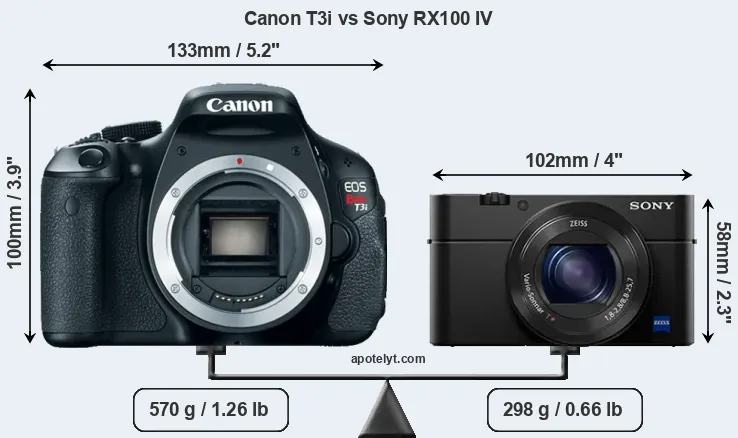 The side-by-side display below illustrates the physical size and weight of the Canon T3i and the Sony RX100 IV. The two cameras are presented according to their relative size. Three consecutive views from the front, the top, and the rear side are shown. All width, height and depth dimensions are rounded to the nearest millimeter.