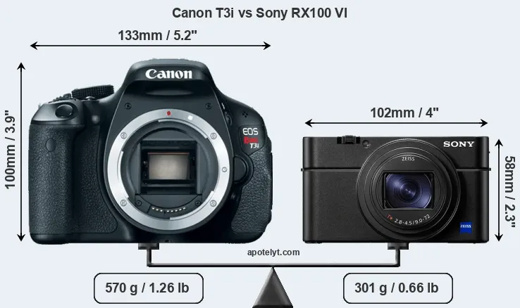 The side-by-side display below illustrates the physical size and weight of the Canon T3i and the Sony RX100 VI. The two cameras are presented according to their relative size. Three consecutive views from the front, the top, and the rear side are shown. All width, height and depth dimensions are rounded to the nearest millimeter.