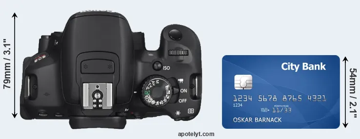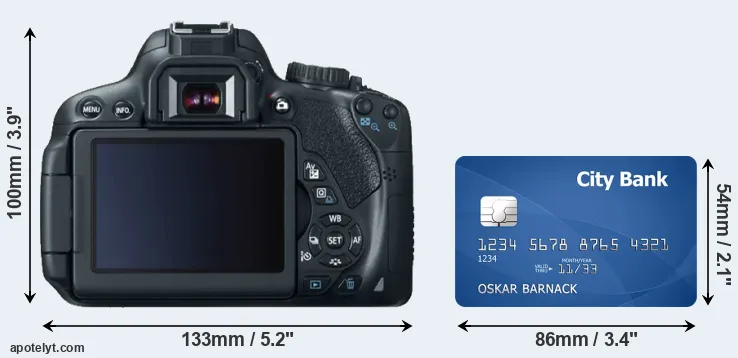 The side-by-side display below illustrates the physical size of the Canon T4i vis-à-vis a credit card. Three successive views from the front, the top, and the rear are shown. All size dimensions are rounded to the nearest millimeter.