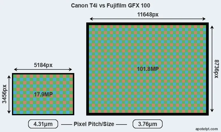| Sensor Specs | Canon T4i | Fujifilm GFX 100 |