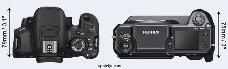 An illustration of the physical size and weight of the Canon T4i and the Fujifilm GFX 100 is provided in the side-by-side display below. The two cameras are presented according to their relative size. Three consecutive perspectives from the front, the top, and the back are available. All width, height and depth measures are rounded to the nearest millimeter.
