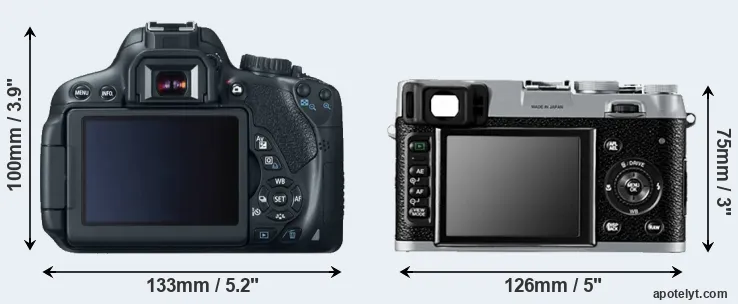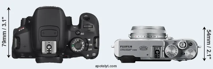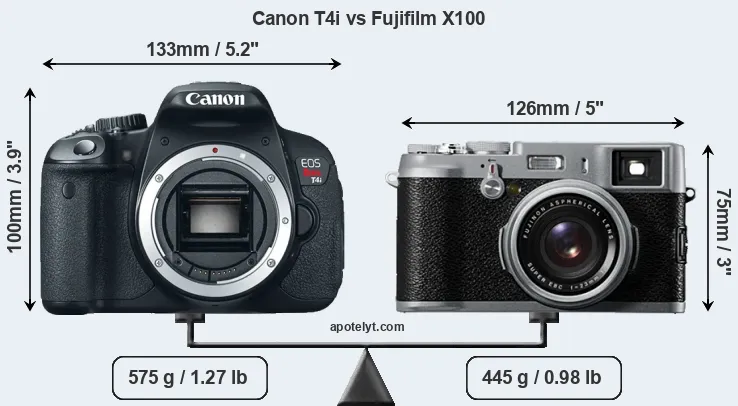 The physical size and weight of the Canon T4i and the Fujifilm X100 are illustrated in the side-by-side display below. The two cameras are presented according to their relative size. Three consecutive views from the front, the top, and the rear side are shown. All size dimensions are rounded to the nearest millimeter.