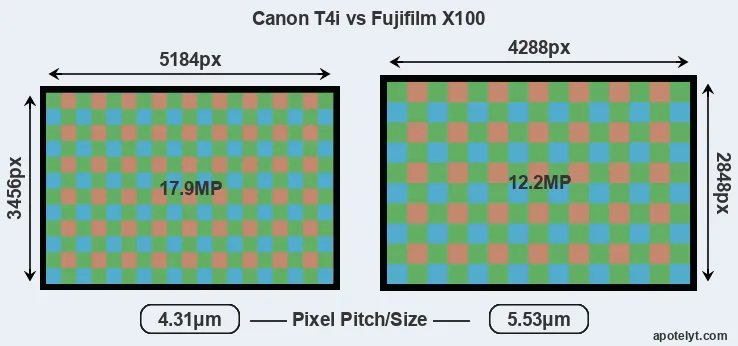 Despite having a smaller sensor, the Canon T4i offers a higher resolution of 17.9 megapixels, compared with 12.2 MP of the Fujifilm X100. This megapixels advantage comes at the cost of a higher pixel density and a smaller size of the individual pixel (with a pixel pitch of 4.31μm versus 5.53μm for the X100). However, it should be noted that the T4i is a somewhat more recent model (by 1 year and 8 months) than the X100, and its sensor might have benefitted from technological advances during this time that partly offset its pixel-size disadvantage.