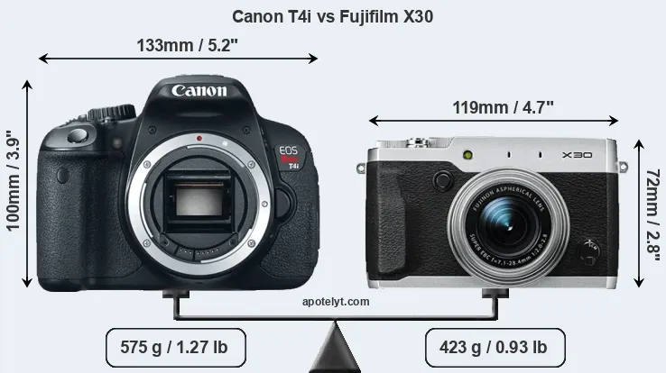 The side-by-side display below illustrates the physical size and weight of the Canon T4i and the Fujifilm X30. The two cameras are presented according to their relative size. Three consecutive views from the front, the top, and the rear side are shown. All width, height and depth dimensions are rounded to the nearest millimeter.