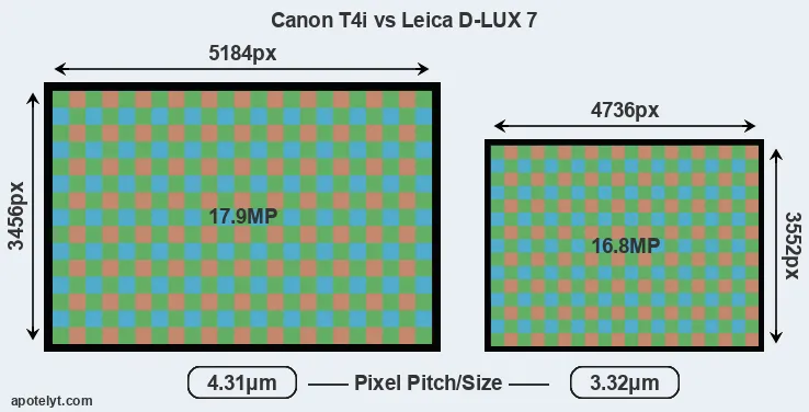 With 17.9MP, the T4i offers a slightly higher resolution than the D-LUX 7 (16.8MP), but the T4i nevertheless has larger individual pixels (pixel pitch of 4.31μm versus 3.32μm for the D-LUX 7) due to its larger sensor. However, the D-LUX 7 is a much more recent model (by 6 years and 5 months) than the T4i, and its sensor will have benefitted from technological advances during this time that further enhance the light gathering capacity of its pixels. Coming back to sensor resolution, it should be mentioned that the D-LUX 7 has no anti-alias filter installed, so that it can capture all the detail its sensor resolves.