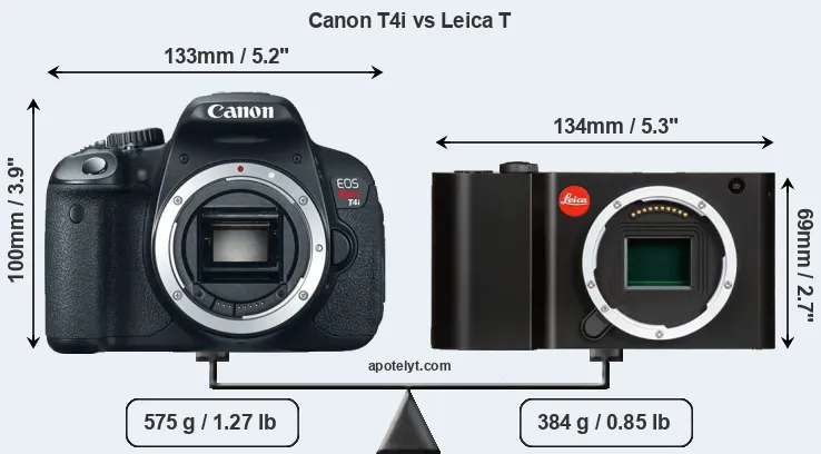 If the front view area (width x height) of the cameras is taken as an aggregate measure of their size, the Leica T is considerably smaller (30 percent) than the Canon T4i. Moreover, the T Typ 701 is markedly lighter (33 percent) than the T4i. In this context, it is worth noting that neither the T4i nor the T Typ 701 are weather-sealed.