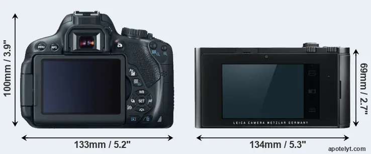 The physical size and weight of the Canon T4i and the Leica T are illustrated in the side-by-side display below. The two cameras are presented according to their relative size. Three consecutive perspectives from the front, the top, and the back are available. All size dimensions are rounded to the nearest millimeter.