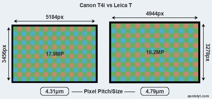 Despite having a smaller sensor, the Canon T4i offers a higher resolution of 17.9 megapixels, compared with 16.2 MP of the Leica T. This megapixels advantage comes at the cost of a higher pixel density and a smaller size of the individual pixel (with a pixel pitch of 4.31μm versus 4.79μm for the T Typ 701). Moreover, it should be noted that the T Typ 701 is a somewhat more recent model (by 1 year and 10 months) than the T4i, and its sensor might have benefitted from technological advances during this time that further enhance the light gathering capacity of its pixel-units. Coming back to sensor resolution, it should be mentioned that the T Typ 701 has no anti-alias filter installed, so that it can capture all the detail its sensor resolves.