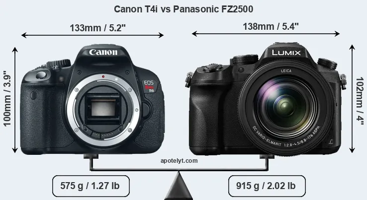 The side-by-side display below illustrates the physical size and weight of the Canon T4i and the Panasonic FZ2500. The two cameras are presented according to their relative size. Three successive views from the front, the top, and the rear are shown. All size dimensions are rounded to the nearest millimeter.
