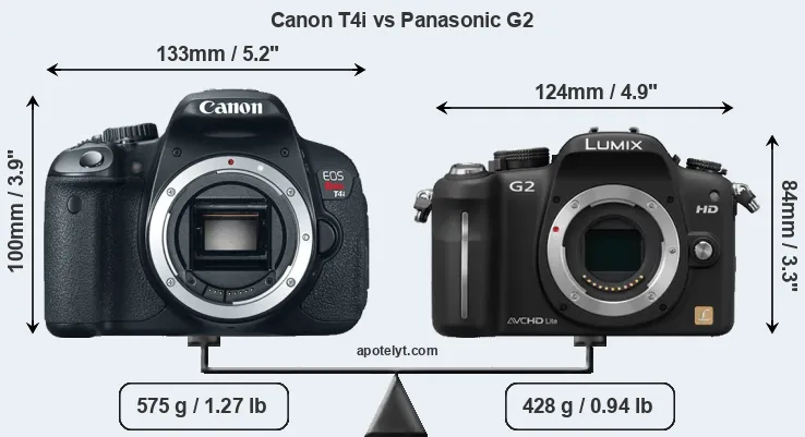 The physical size and weight of the Canon T4i and the Panasonic G2 are illustrated in the side-by-side display below. The two cameras are presented according to their relative size. Three consecutive perspectives from the front, the top, and the back are available. All width, height and depth measures are rounded to the nearest millimeter.