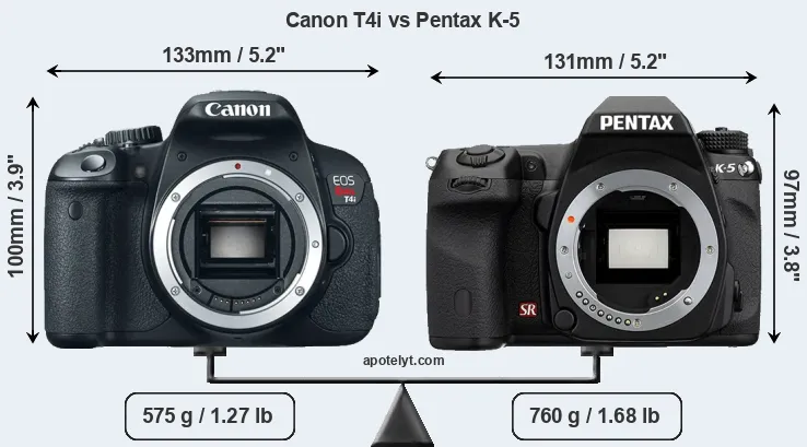 The physical size and weight of the Canon T4i and the Pentax K-5 are illustrated in the side-by-side display below. The two cameras are presented according to their relative size. Three consecutive views from the front, the top, and the rear side are shown. All width, height and depth measures are rounded to the nearest millimeter.